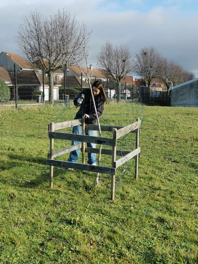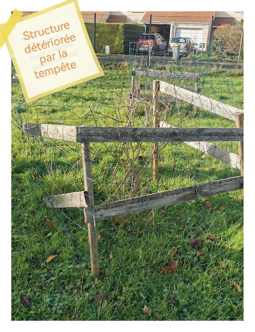 Les vents violents qui ont soufflé cet été sur nos pelouses ont détérioré les structures en bois qui avaient été construites et installées par les éco-délégués les années précédentes pour protéger les jeunes arbres du broutage des brebis lorsqu’elles sont sur site.